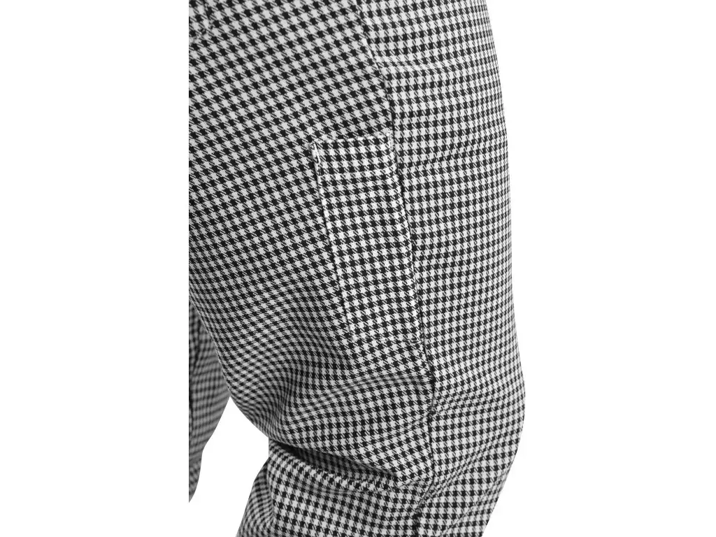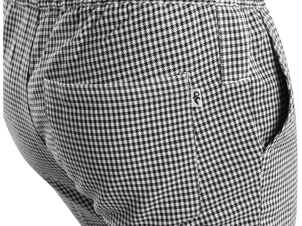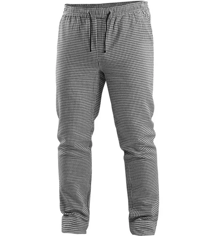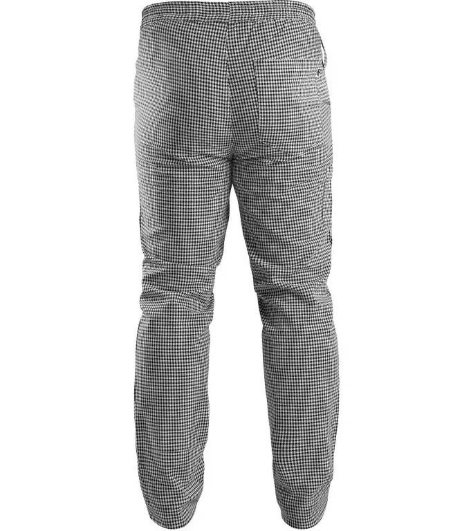 Pánské kuchařské kalhoty v oblíbeném vzoru pepito kombinují pohodlí a funkční detaily pro každodenní práci v gastronomii. Elastický pas s gumou a tkanicí na stažení umožňuje snadné přizpůsobení postavě a zajišťuje komfort i během dlouhého pracovního dne. Přední klínové kapsy a zadní našitá kapsa jsou určeny pro uložení drobností. Na pravém stehně se nachází praktická kapsa na kuchařskou pinzetu nebo tužku, která umožňuje mít důležité pomůcky vždy po ruce. V zadní části pod pasem je navíc poutko na utěrku pro ještě větší praktičnost při práci v kuchyni. Kalhoty jsou vybaveny EASY-PROLONG systémem, který umožňuje snadné prodloužení střihu na vyšší postavu uvolněním kontrastního švu na nohavicích. Doporučené použití: hotelové kuchyně, závodní a školní jídelny, bistra, kuchařské školy, řeznictví.