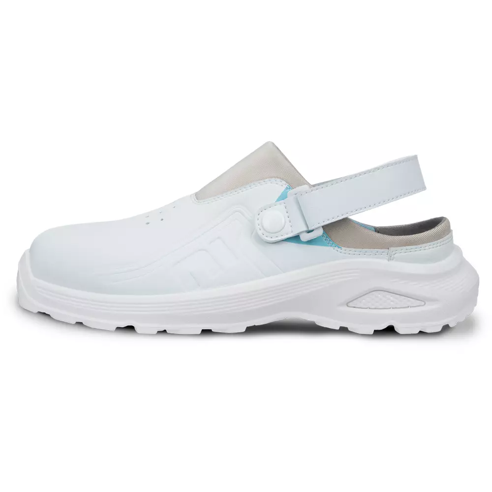 • bílý bezpečnostní pantofel HYGOSAFE je navržený pro prostředí se zvýšenými nároky na hygienu, čistotu a komfort • dvouhustotní podešev PU/PU s patní vkladkou z NHP pěny zajišťuje výrazně měkčí došlap a vyšší pohodlí při celodenním nošení • unikátní kombinace hydrofobního mikrovlákna a neoprenu vytváří odolný, snadno udržovatelný svršek, který si zachovává pružnost a komfort • bezpečnostní tužinka s příměsí uhlíkových vláken přináší nízkou hmotnost bez kompromisu na bezpečnosti • antibakteriální mesh podšívka podporuje ventilaci a příjemné klima uvnitř obuvi • odepínací patní pásek na suchý zip umožňuje upevnění obuvi dle individuálních požadavků pracovníka