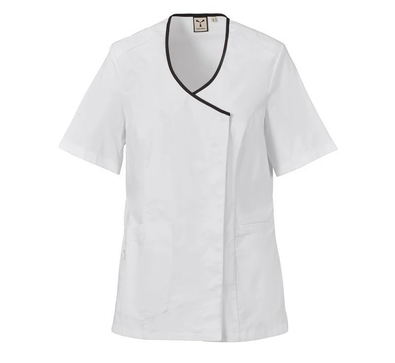 Dámský plášť s krátkým rukávem, z bavlněného popelínu, polyesteru a Lycry ® T400 ®, s vynikajícími elastickými a prodyšnými vlastnostmi. Výstřih do V s kontrastním barevným lemem. Zapínání na skryté druky a lehká síťovaná luneta v podpaží pro zlepšení prodyšnosti. Dvě kapsy ve spodní části: jedna prostřižená a jedna našitá s ikonickou vyšívanou vrtulí tón v tónu. Boční rozparky a záševky na zádech.