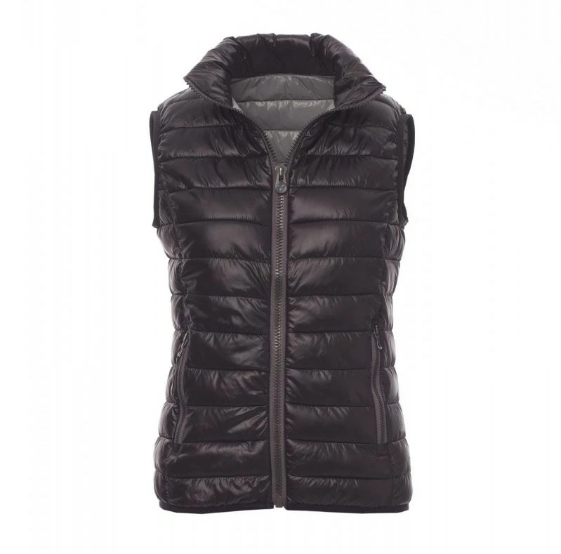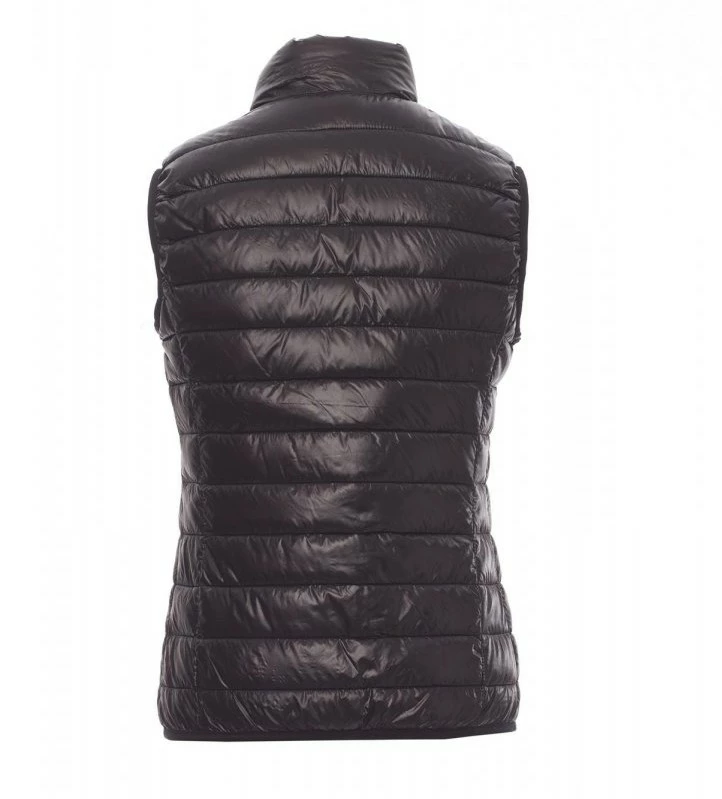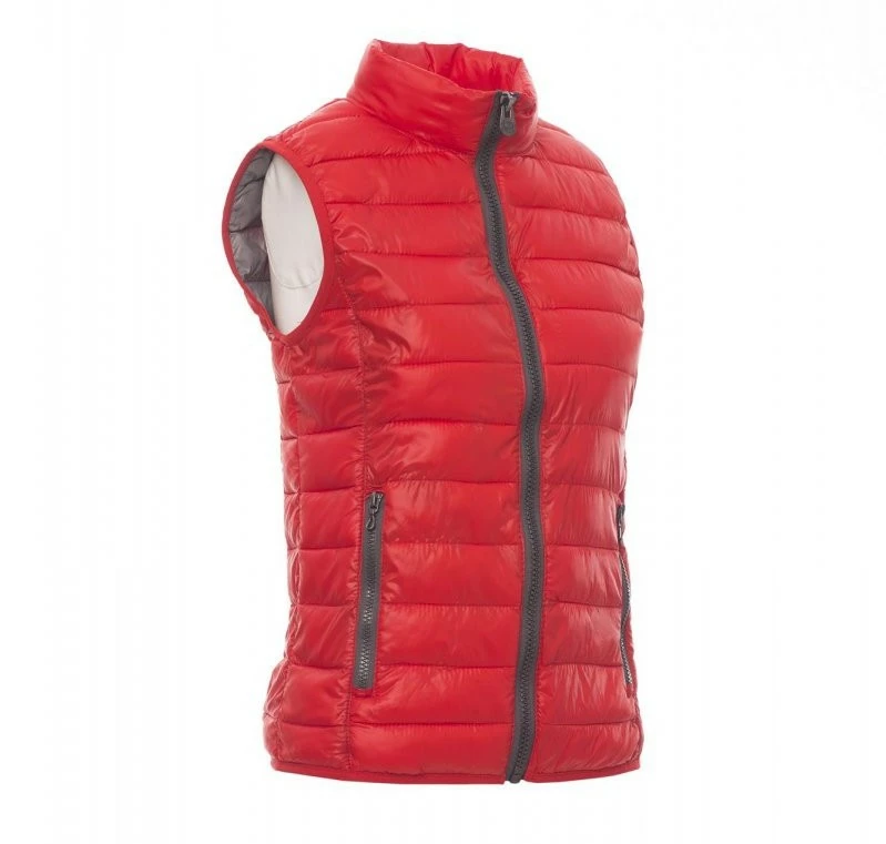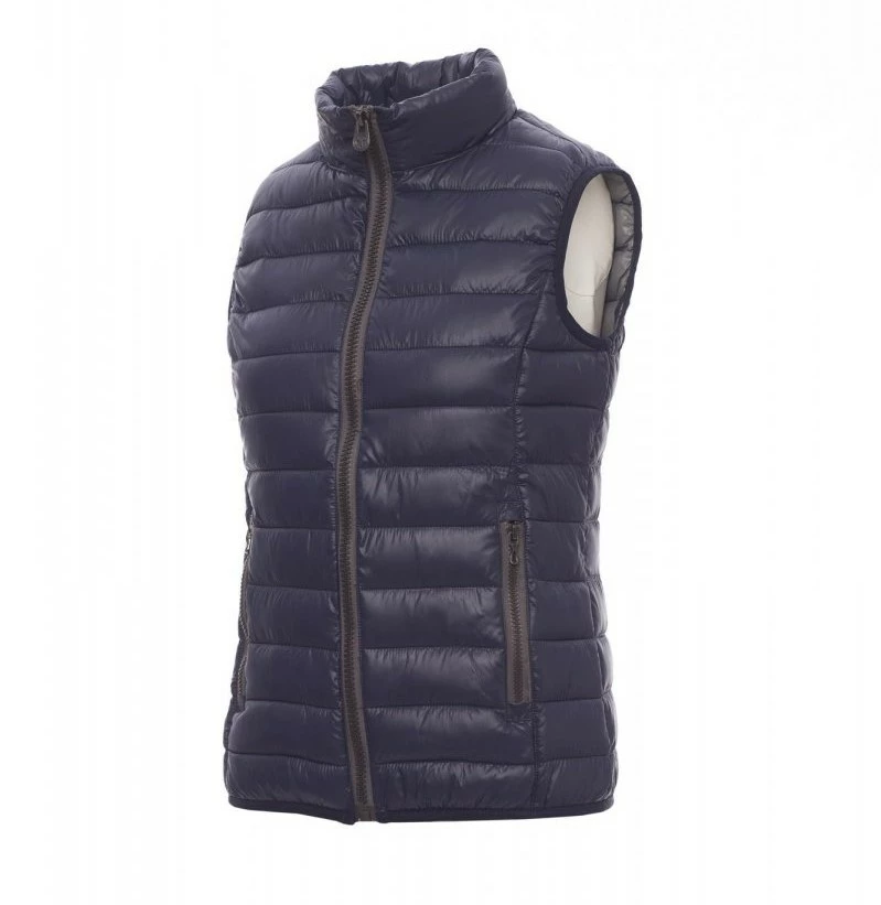 Dámská ergonomická vesta/větrovka, 8mm kontrastní plastový zip s kovovým jezdcem, tenký lem v pase, dvě vnější kapsy. Vnitřek: polyesterové zateplení s efektem péřové náplně, tři kapsy.