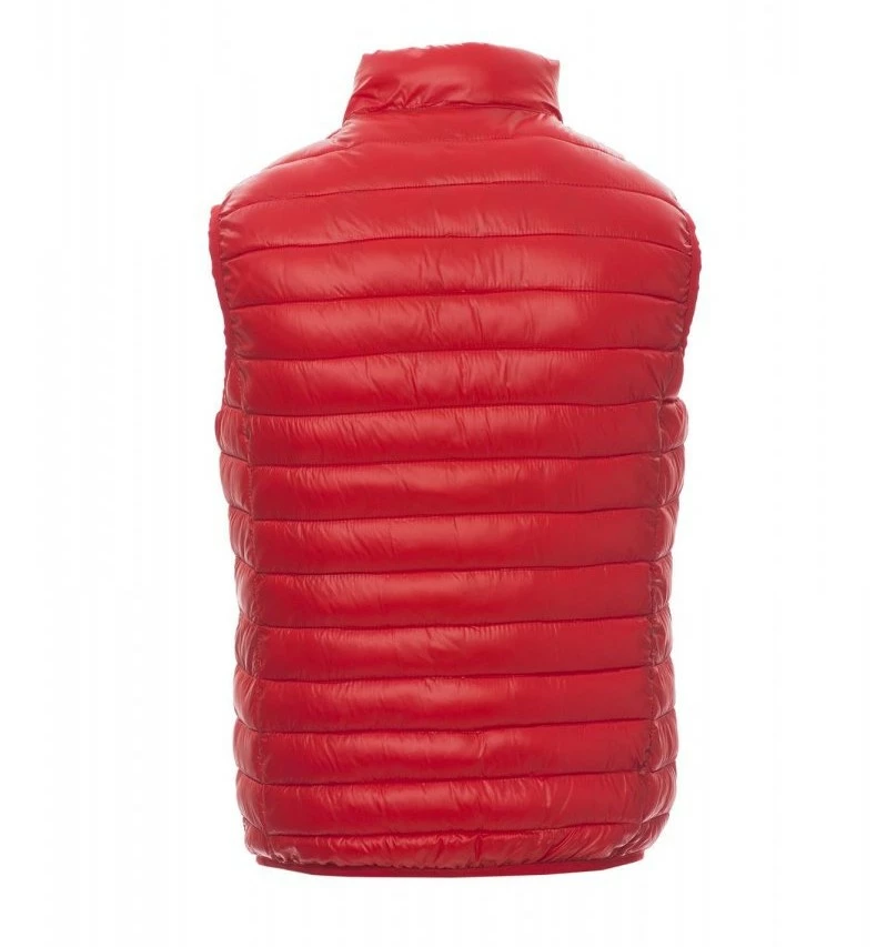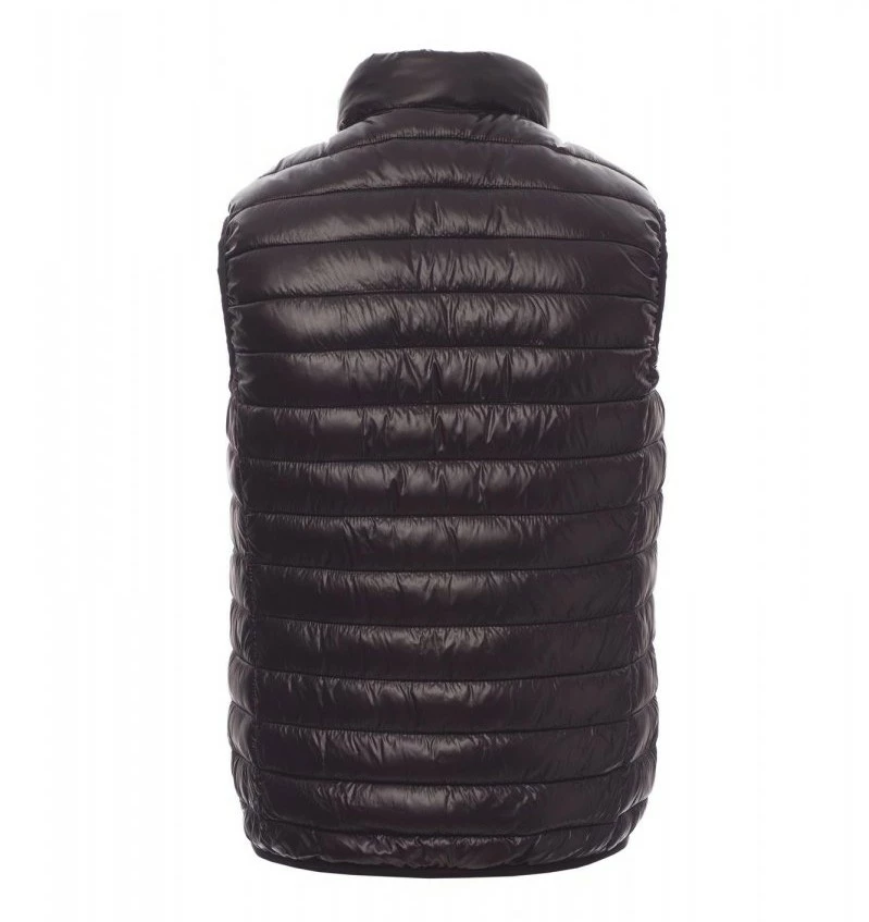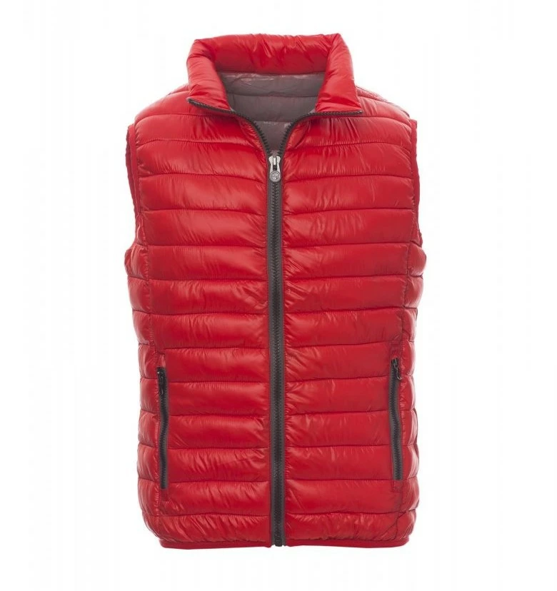 Pánská vesta/větrovka, 8mm kontrastní plastový zip s kovovým jezdcem, tenký lem v pase, dvě vnější kapsy. Vnitřek: polyesterové zateplení s efektem péřové náplně, tři kapsy.