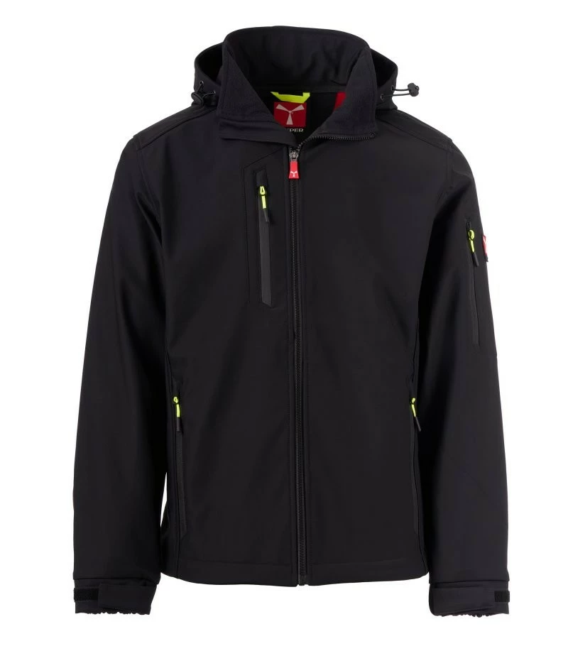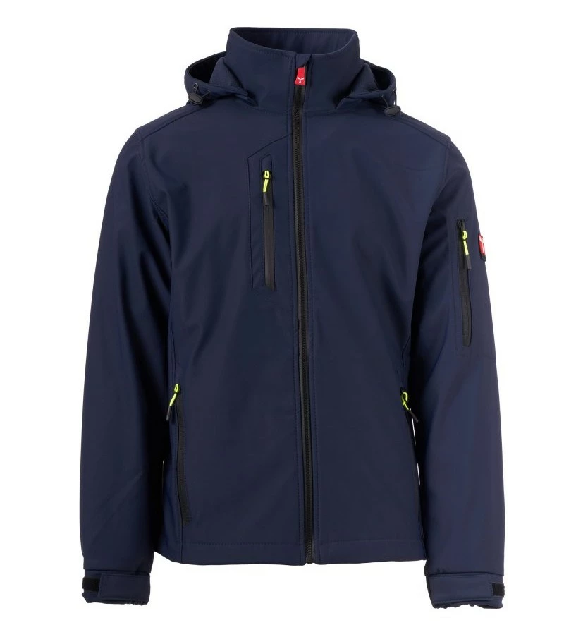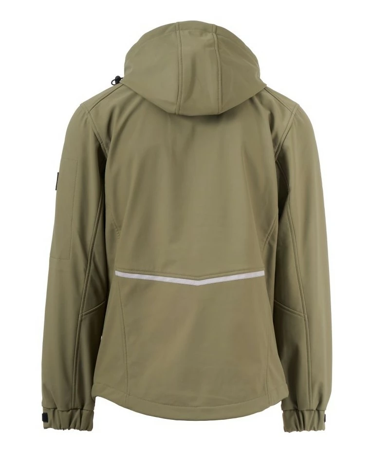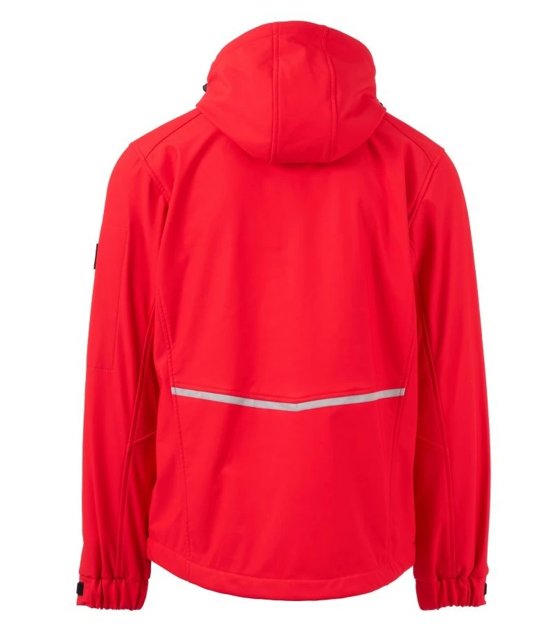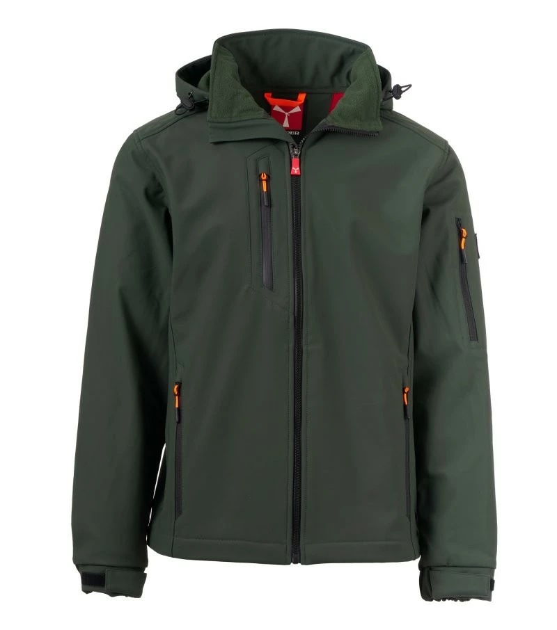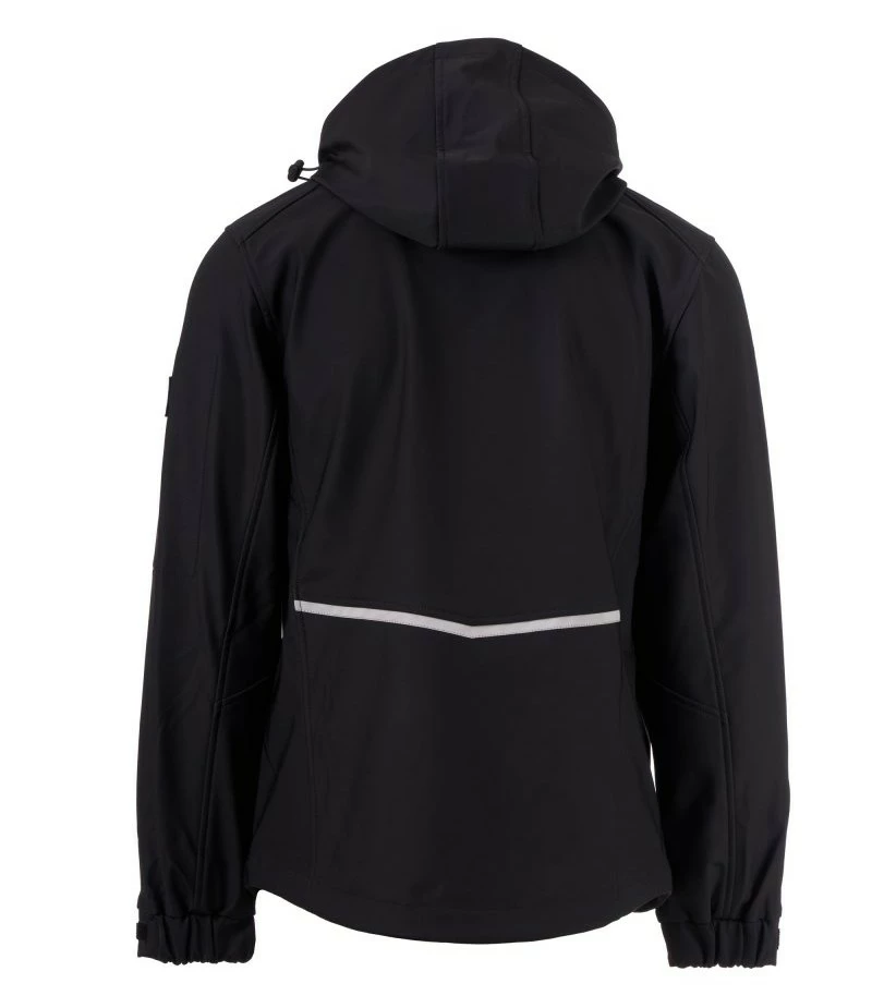 Pánský lehký softshell 3 vrstvy, zapínání na zip SBS s kovovým jezdcem „semi-auto lock“ a přizpůsobeným taháčkem. Odnímatelná kapuce se stahovací šňůrkou. Reflexní pásky ve spodní části zad a zadní straně kapuce. Elastické stahovací manžety na suchý zip. Dvě boční kapsy na zip, jedna kapsa na hrudi s voděodolným zipem a jedna kapsa na levé paži s integrovaným očkem na pero na zip. Fluorescentní taháčky. Jedna vnitřní prostřižená kapsa na suchý zip. Spodní část stažitelná pomocí přizpůsobených zarážek.