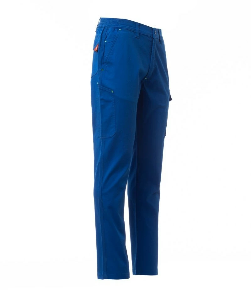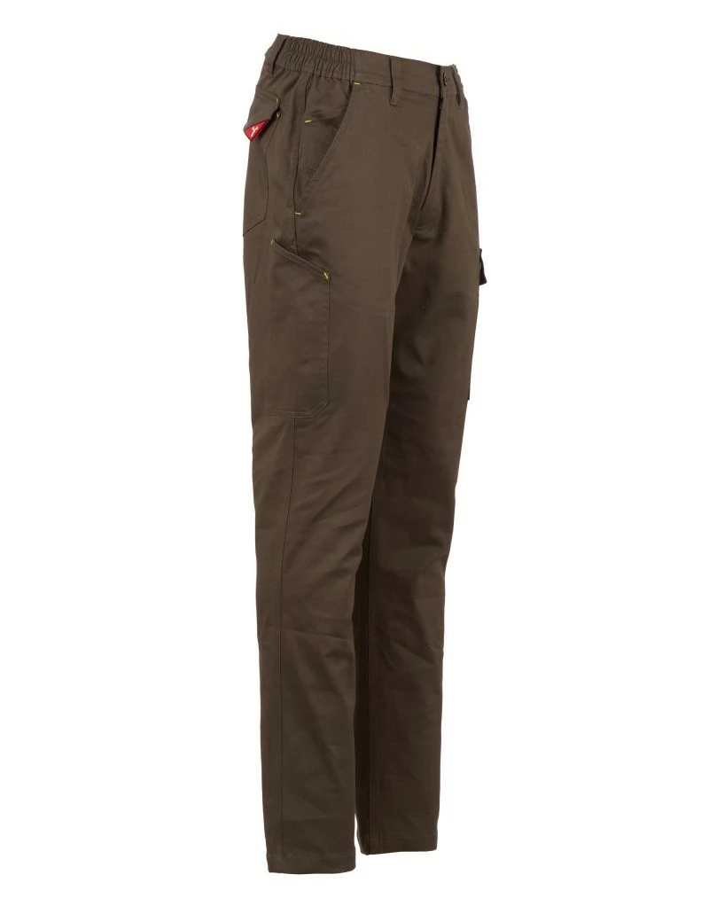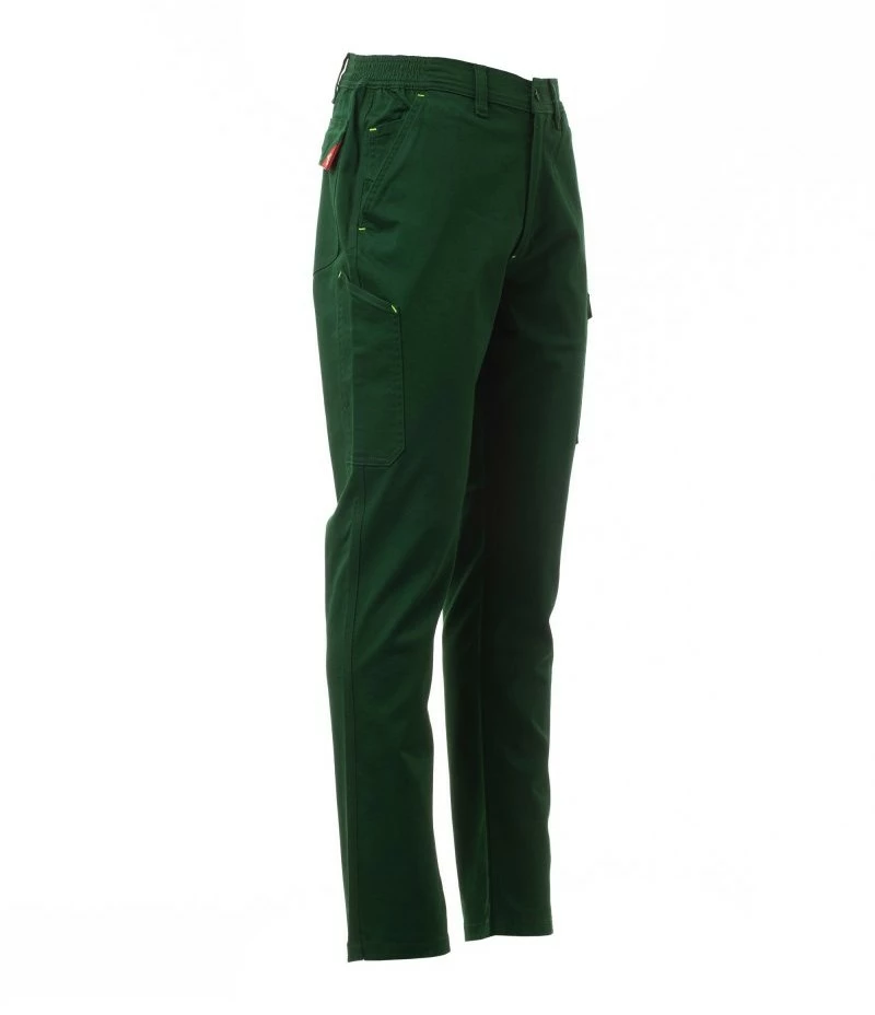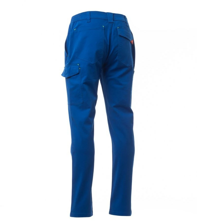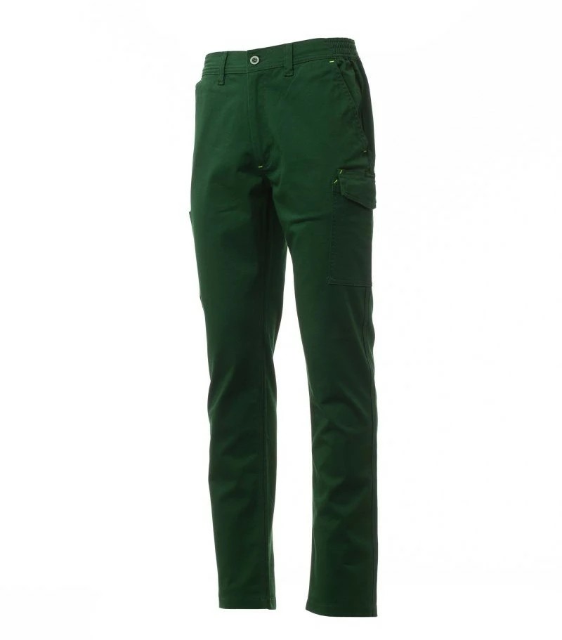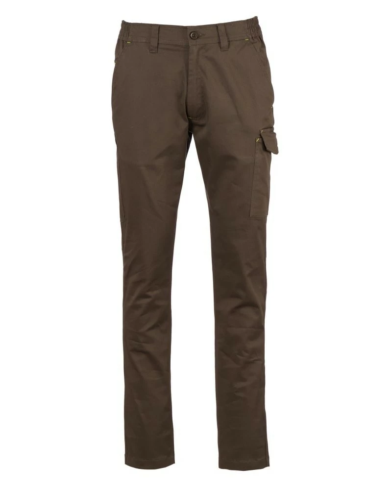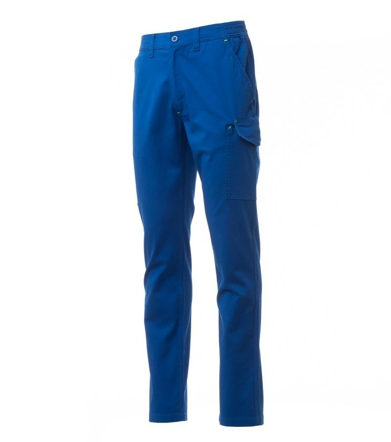 Kalhoty s poutky a s elastickým páskem v pase, zapínání na zip a knoflík, zpevněné prošití trojjehlou v rozkroku a na vnitřní straně nohavice, prošití na boku dvojjehlou, dvě přední kapsy klasického střihu, kapsička na mince, pravá postranní kapsa na svinovací metr, levá postranní kapsa s uzavírací klopou LOCK SYSTEM, dvě zadní kapsy, z nich jedna s klopou na suchý zip.