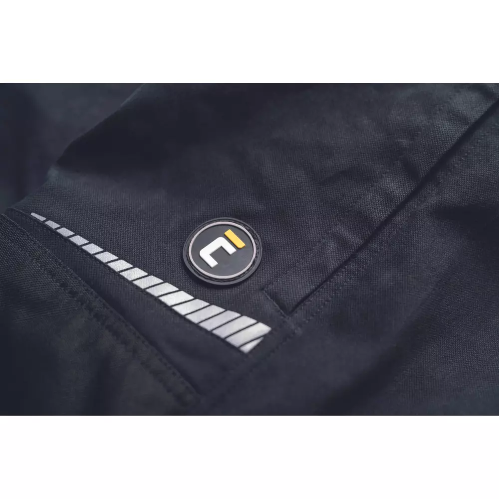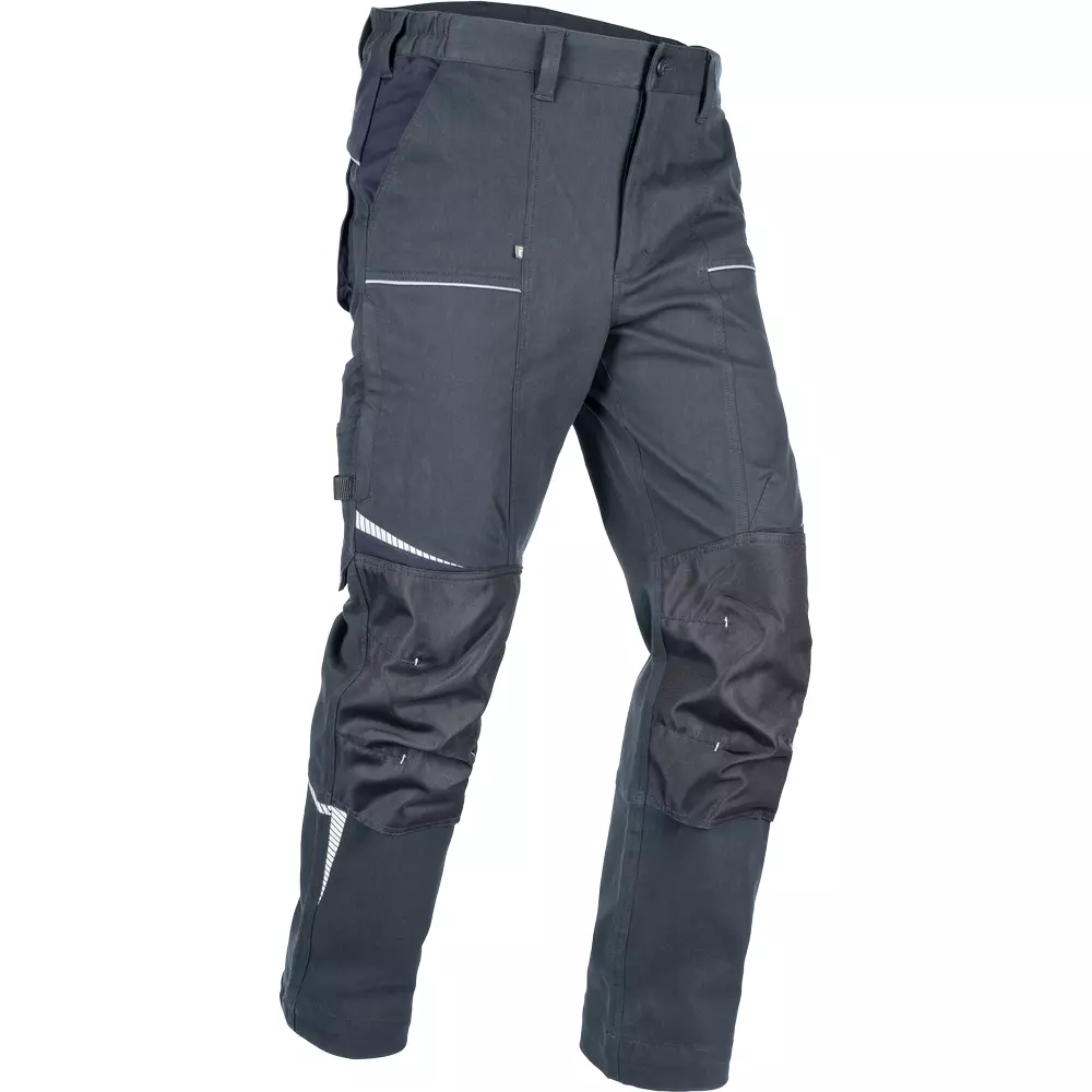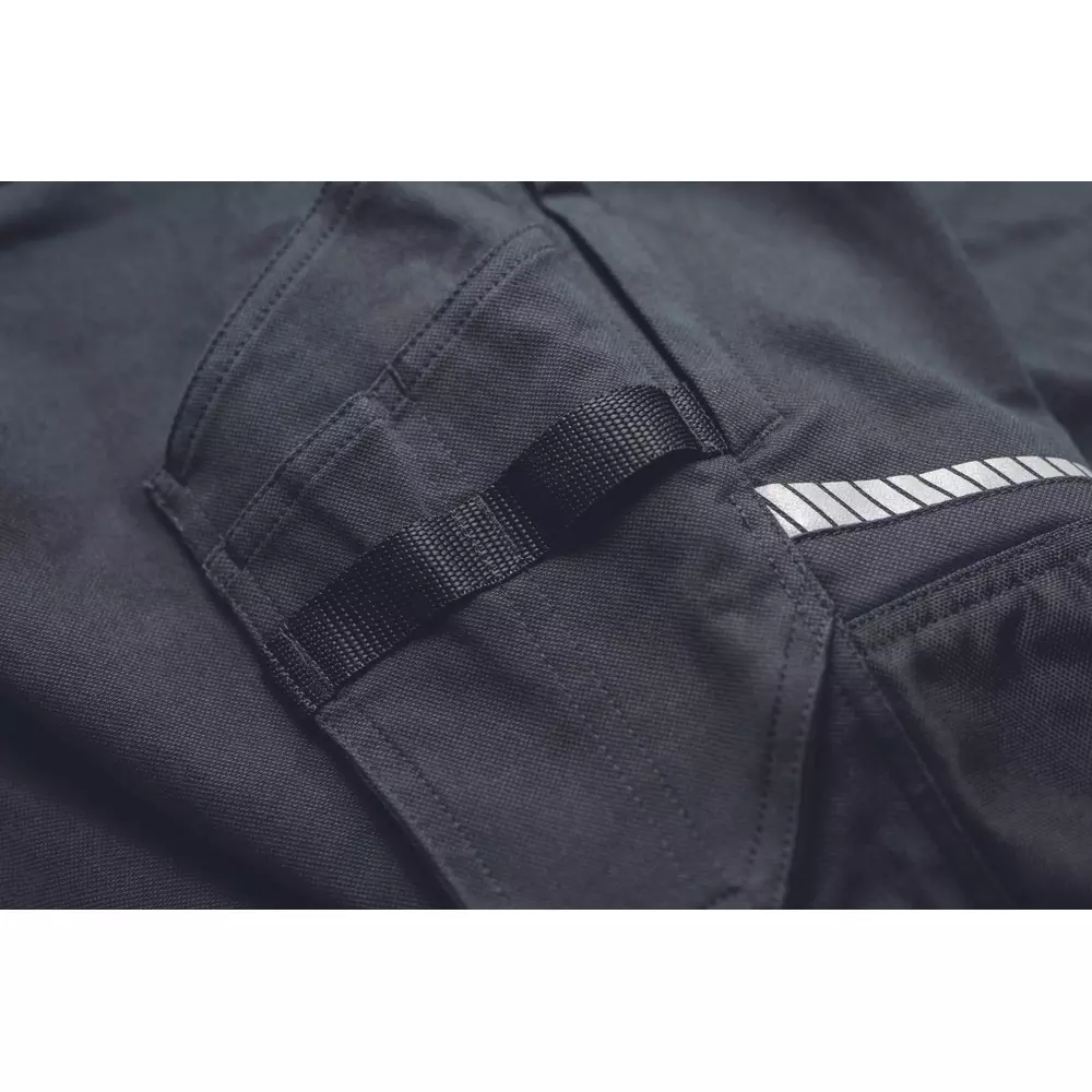 • pánské pracovní kalhoty ze strečové tkaniny • pružný pas s poutky na opasek • 2 přední kapsy, 2 zadní kapsy • 2 stehenní ventilační mesh kapsy na zip • 1 multifunkční kapsa na pravém stehně • zesílené kolenní části pro vložení kolenních chráničů • reflexní lemování a tištěné reflexní detaily • nohavice prodloužitelné o 5 cm