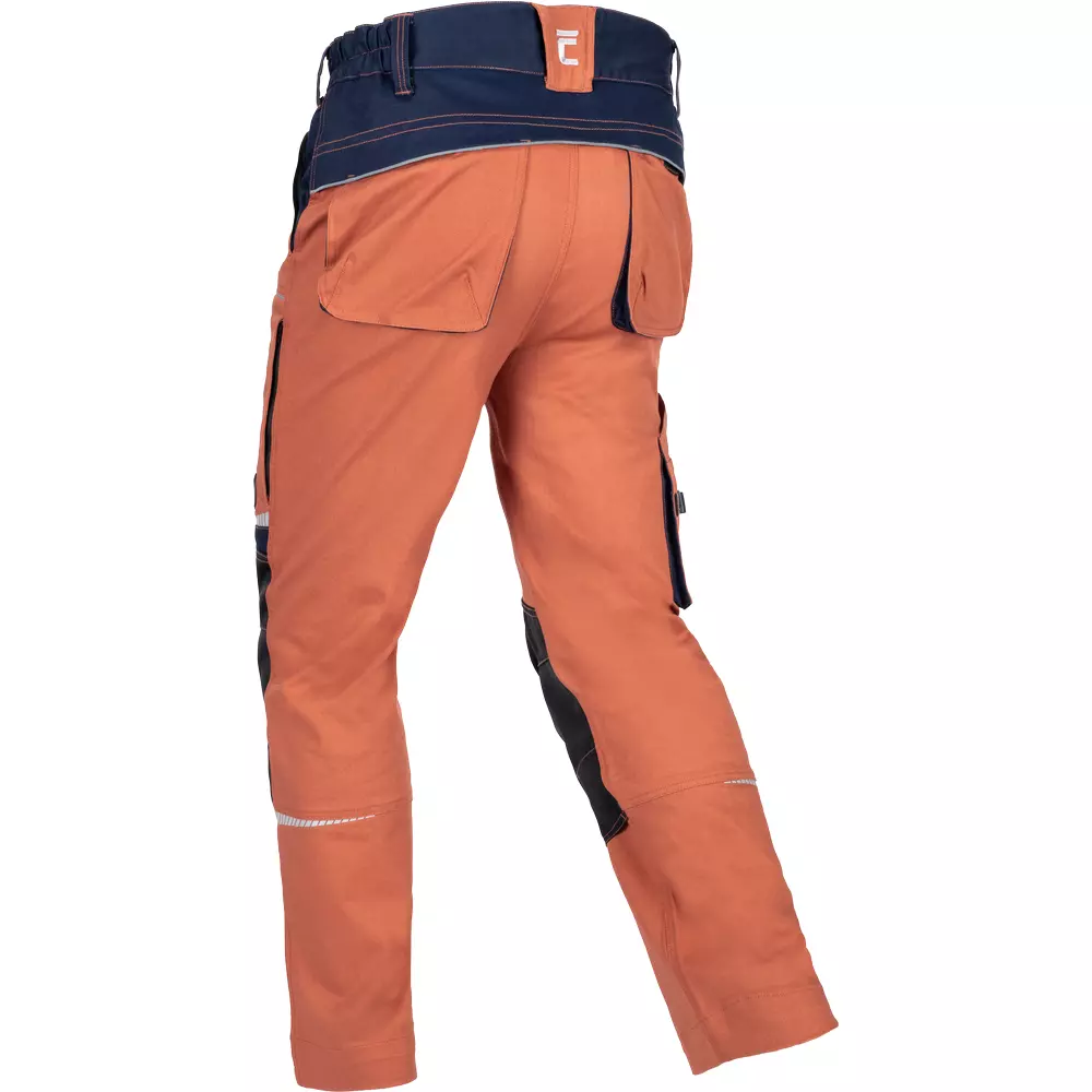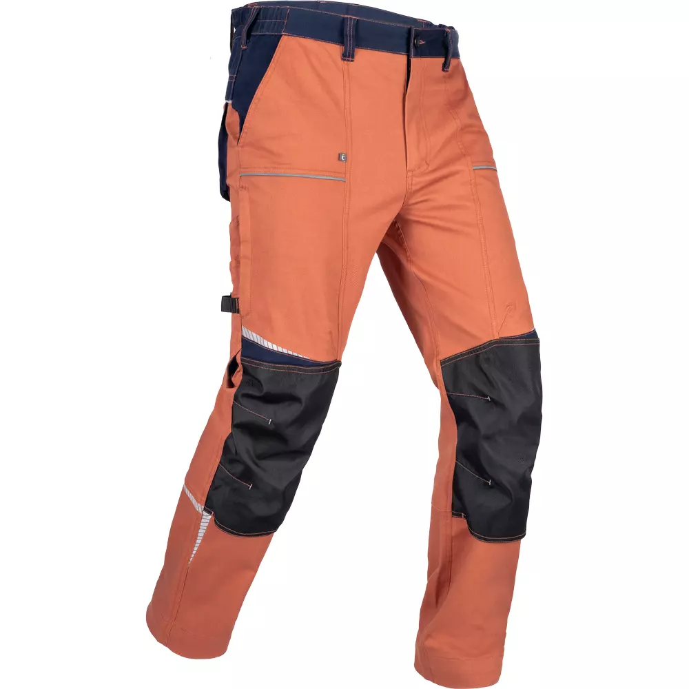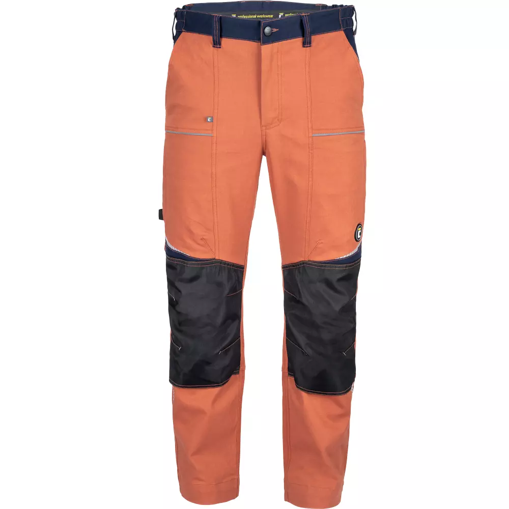 • pánské pracovní kalhoty ze strečové tkaniny • pružný pas s poutky na opasek • 2 přední kapsy, 2 zadní kapsy • 2 stehenní ventilační mesh kapsy na zip • 1 multifunkční kapsa na pravém stehně • zesílené kolenní části pro vložení kolenních chráničů • reflexní lemování a tištěné reflexní detaily • nohavice prodloužitelné o 5 cm