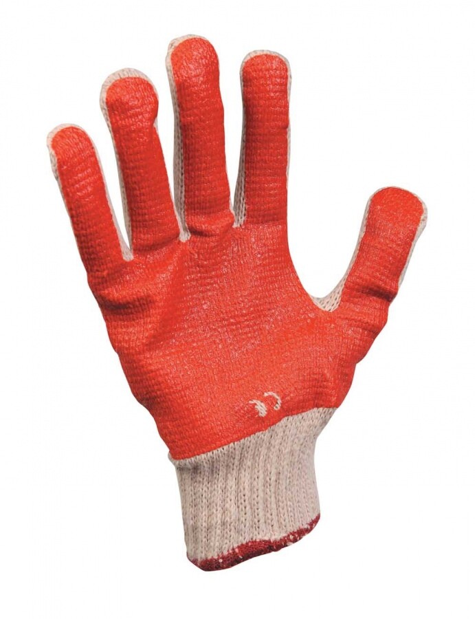 Pracovní pletené bezešvé bavlněné různobarevné rukavice • polomáčené v barevném PVC v dlani a na prstech • pružná manžeta